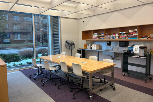 Maker Max Tables with butcher block tops were added to a provide large, shared work surface in the teen area. Two tables measuring 120″W x 42″d x 29″H feature brushed stainless steel frames, locking casters, and built-in power outlets.